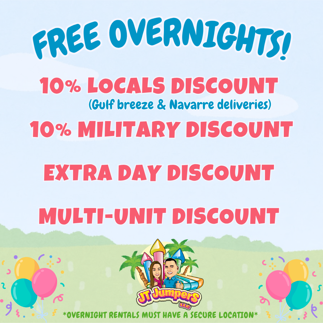 At JT Jumpers, we’re passionate about bringing excitement and laughter to every event. As a family and Veteran owned and operated company in Gulf Breeze, FL, we specialize in clean, safe, and affordable bounce house and inflatable rentals.