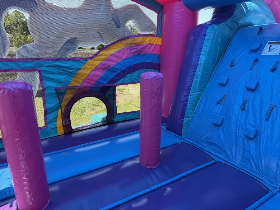 Transform your next party into a whimsical wonderland with our Enchanted Unicorn Combo (DRY). This breathtaking inflatable rental is the perfect centerpiece for birthdays, school events, community gatherings, and any occasion that deserves a touch of magic! Featuring a charming unicorn, a brilliant rainbow arch over the slide, and a vibrant color palette, this combo will enchant guests of all ages.