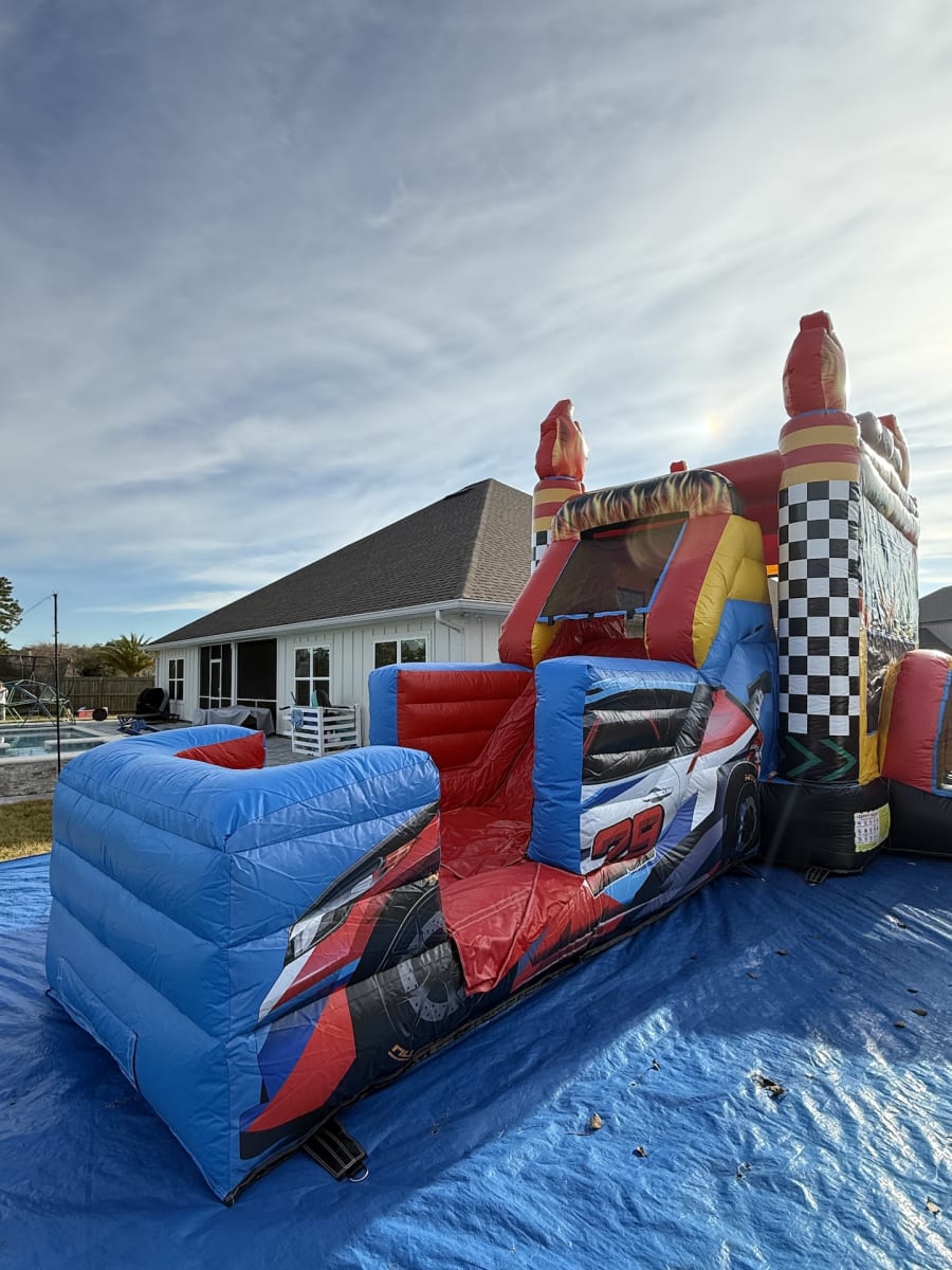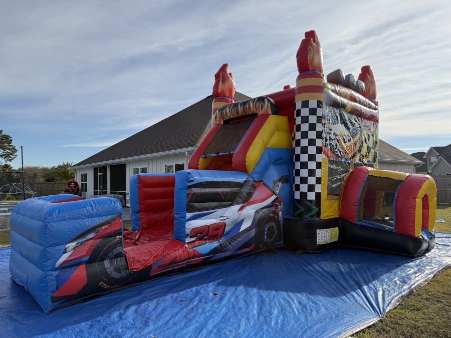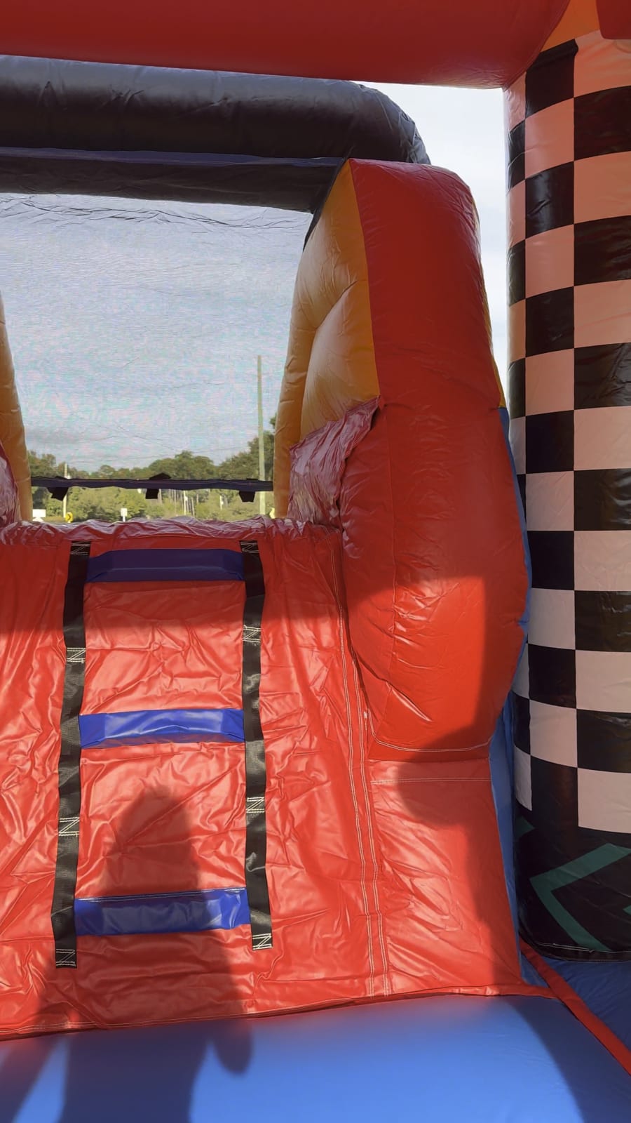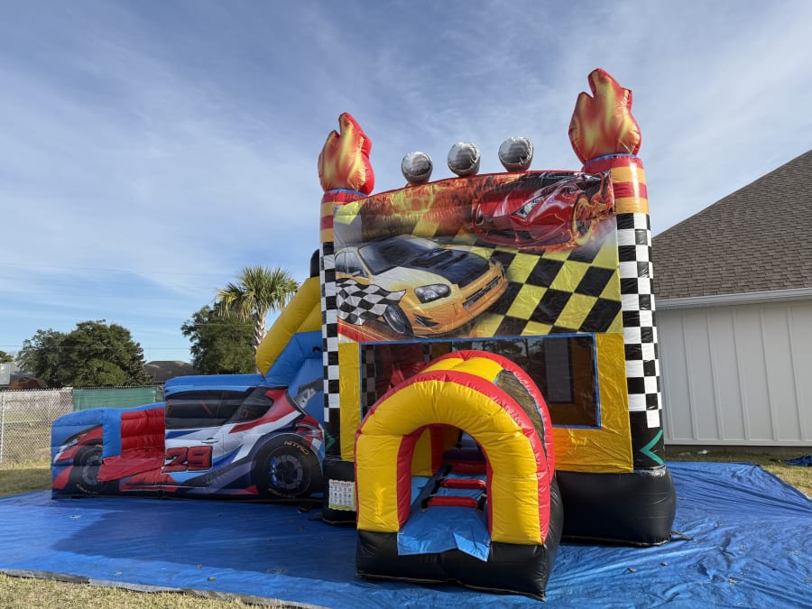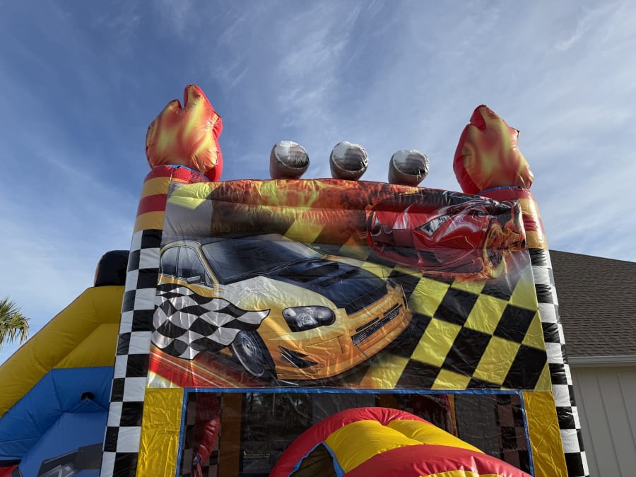 Race Car Combo (WET or DRY) delivers thrilling inflatable fun with race-themed graphics, a single-lane slide, climbing wall, and built-in basketball hoop. Choose a wet setup for splashy summer excitement or a dry layout for year-round use. Fast to inflate. Easy to supervise. Perfect for parties and events. 🚗💦🏁