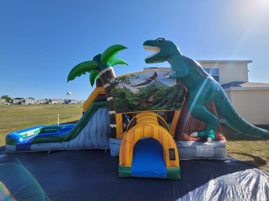 Take a trip to the dinosaur ages with this amazing Dino Dip unit! The Dino Dip is a 6-in-1 Combo that includes a bounce house, basketball hoop, climbing wall and dual slides. The entrance is decorated with a graphic dinosaur banner and a gigantic T-Rex. This unit is rented dry. Dimensions are 38'L x 15'W x 16'H.