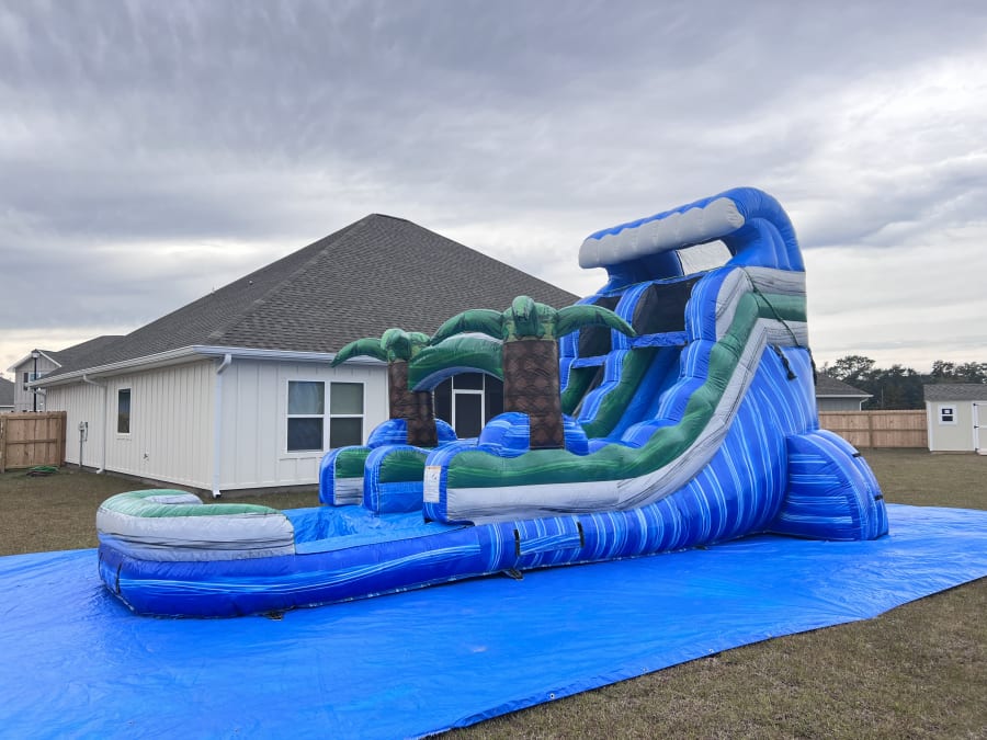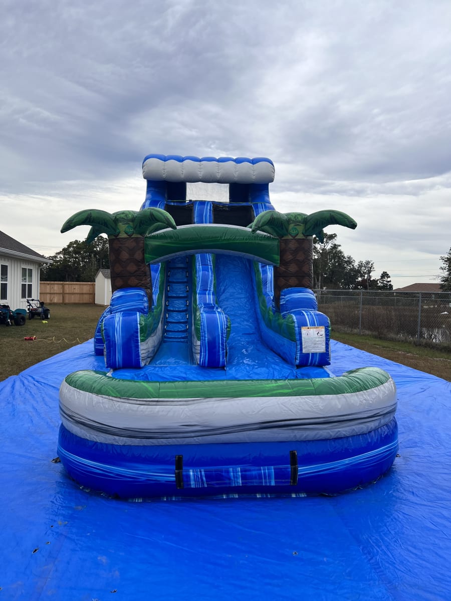The Blue Lagoon offers a beautiful deep blue color with 2 palm trees and a large wave at the top. The ladder stairs lead up to an 16 ft high single lane slide that will take you down into a wading pool area. Measurements are 29'L x 18'W x 16'H. This unit can be rented wet or dry.