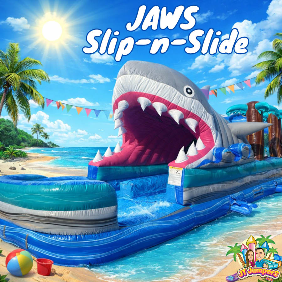 The Jaws Dual Lane Slip N Slide is the ultimate backyard thrill ride. Featuring a massive open-mouthed shark entrance and TWO racing lanes, this inflatable is perfect for kids, teens, and even competitive adults who aren’t afraid to get soaked.